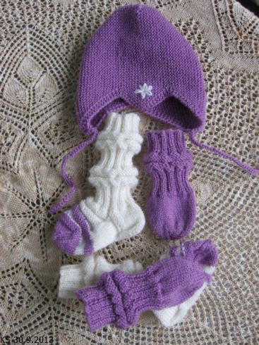 Villen ystäväperheeseen syntyi tyttö, pieni söpöläinen. Kun nyt oli kohde, jolle neuloa, niin pienet vauva-asusteet tein tyttöselle. BabyUll lankaa oli jäänyt systerin unisukista ja ajattelin sen riittävän vauvasukkiin. Vaan loppuihan se kesken kaiken, piti siis ostaa lisää lankaa. Ja taas jäi pieni jämänöttönen, noh ehkä sitä jäi vähemmän mitä alkuperäinen jämä oli.