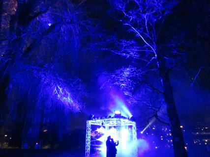 Valotaiteilija Kari Kolan ympäristövaloteos oli levittäytynyt isolle alueelle, sinistä ja usvaa riitti.