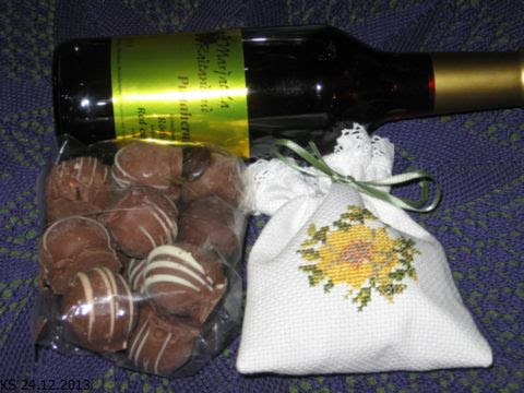 Tässä tämä ilta on vain mennyt, radiosta on ollut kiva kuunnella Ilmasilta-ohjelmaa = ulkosuomalaisten joulunviettoa ympäri maalimaa. Nyt laitan pikku suukkiini pari Susin tuomaa käsintehtyä suklaapalleroa, namskis. Tuoksupussi on myös Susilta ja mehupullo on se Punaherukkamehu, jonka mainitsin ateriajuomana.